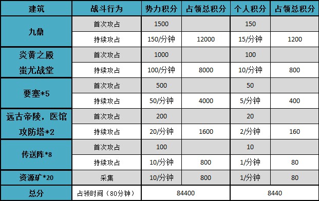 “九鼎之战”将根据双方联盟的九鼎控制时间、迁城次数、攻占传送点次数、建筑得分、杀敌得分、粮仓抢占数量共6项条件进行积分汇总。在结束时,势力积分高的联盟将获得胜利。当然个人积分同样重要,奖励的档次是按个人积分决定的。!这也更考验联盟的综合管理及作战能力!
